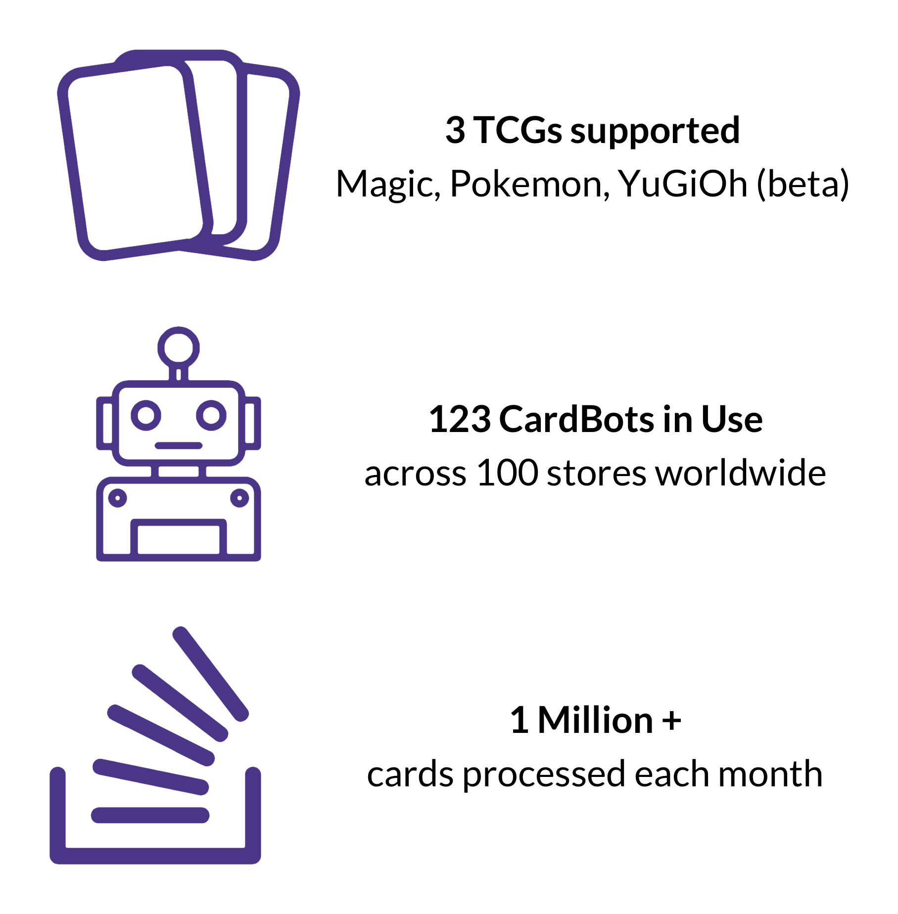 We've come a long way from our crowdfunding campaign in 2019 and delivering the first 30 units at the end of 2020. Since that time, we've reworked the hardware design to improve speed, reliability and accuracy, drastically improved the inventory management platform, and added support for 2 new games (YuGiOh is currently in beta). There are now 123 CardBots in the wild, in 100 stores across North and South America, Europe and the UK, and Oceania.